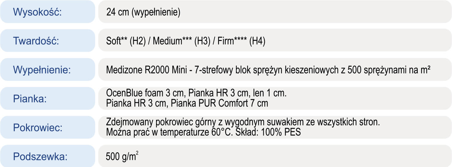 - Medizione R2000 Mini – to innowacyjny 7-strefowy blok niezależnych sprężyn, który gwarantuje równomierny rozkład nacisku ciała na całej powierzchni;
